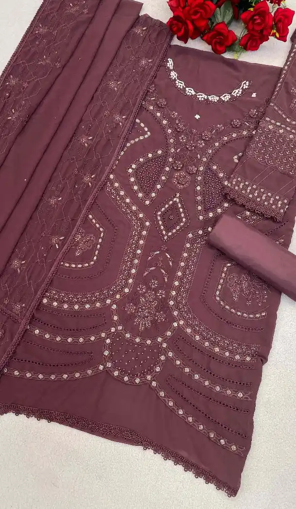 Elevate your style with this stunning Pakistani Suit. Beautifully crafted from high-quality Georgette, this piece is a must-have for your wardrobe. The exquisite Embroidery & Zari Sequence Work adds a touch of elegance and sophistication, making it perfect for any occasion.